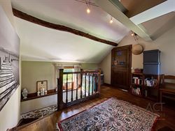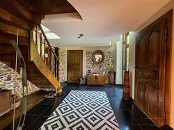 L’intérieur propose de beaux volumes et une atmosphère chaleureuse : vaste hall d’entrée, séjour lumineux avec accès direct à la terrasse, salle à manger légèrement surélevée, cuisine équipée avec arrière-cuisine, buanderie, chaufferie, toilettes. À l’étage, trois chambres (dont une avec mezzanine), une salle de bain, une salle de douche et un espace bureau offrent une configuration fonctionnelle et familiale. Une cave est également présente en sous-sol.