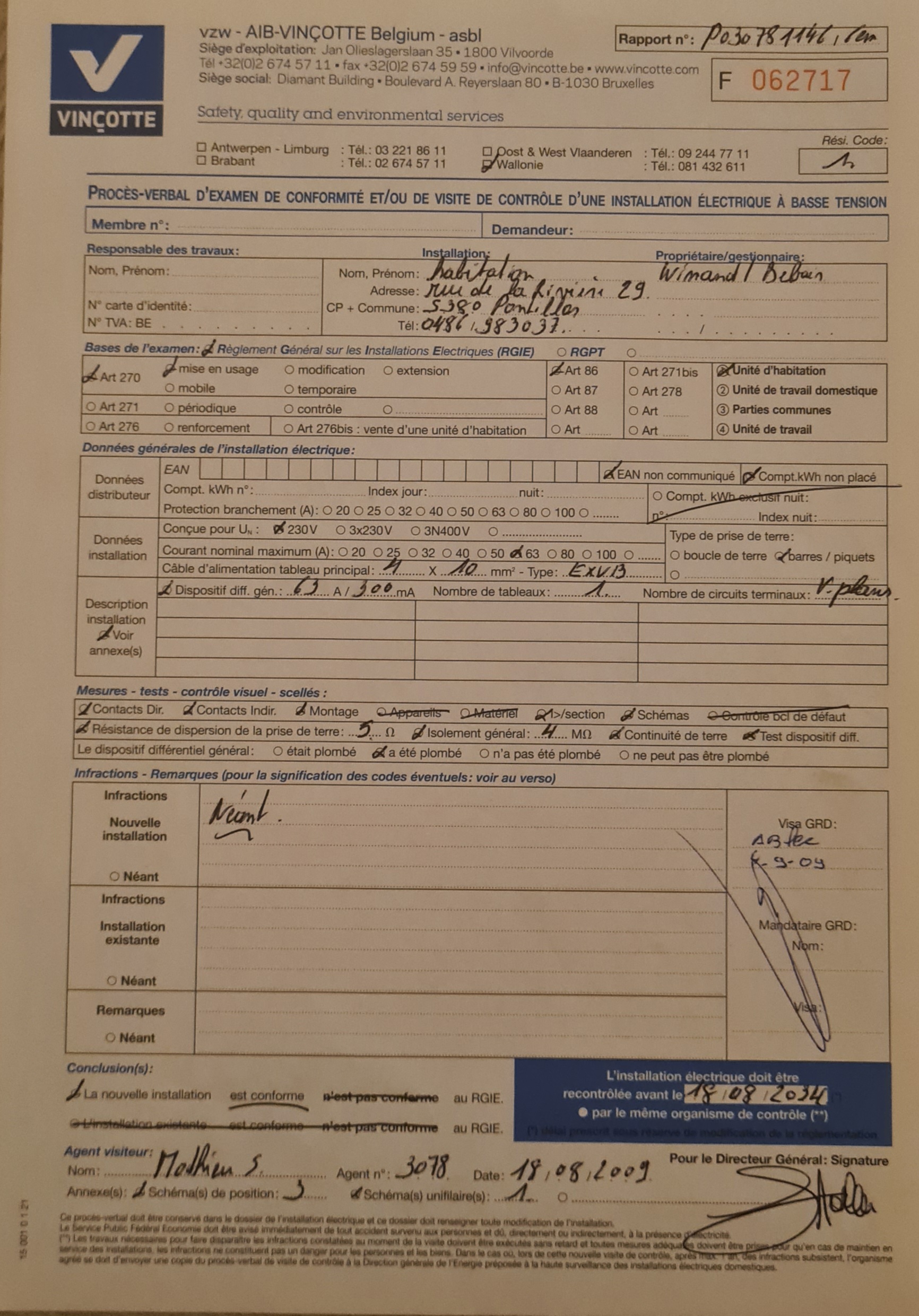 Installation électrique : conforme jusqu'au 18/08/2034 - certificat disponible sur demande